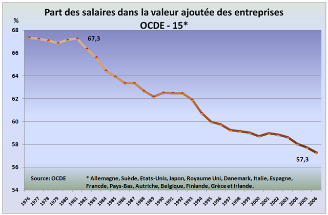 Le couple financiarisation – libre échange a rendu impossible toute forme de lutte des classes. Les salariats sont entrés en concurrence les uns avec les autres et sans possibilités de s'allier, quand le patronat s'est dissous dans des lois économiques anonymes et impersonnelles. Dans ces conditions, le rapport de force ne peut que tourner à l'avantage du capital sur le travail. (graphique trouvé sur l'excellent blog déchiffrages)